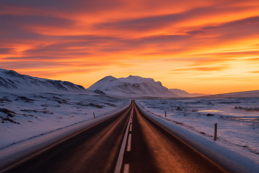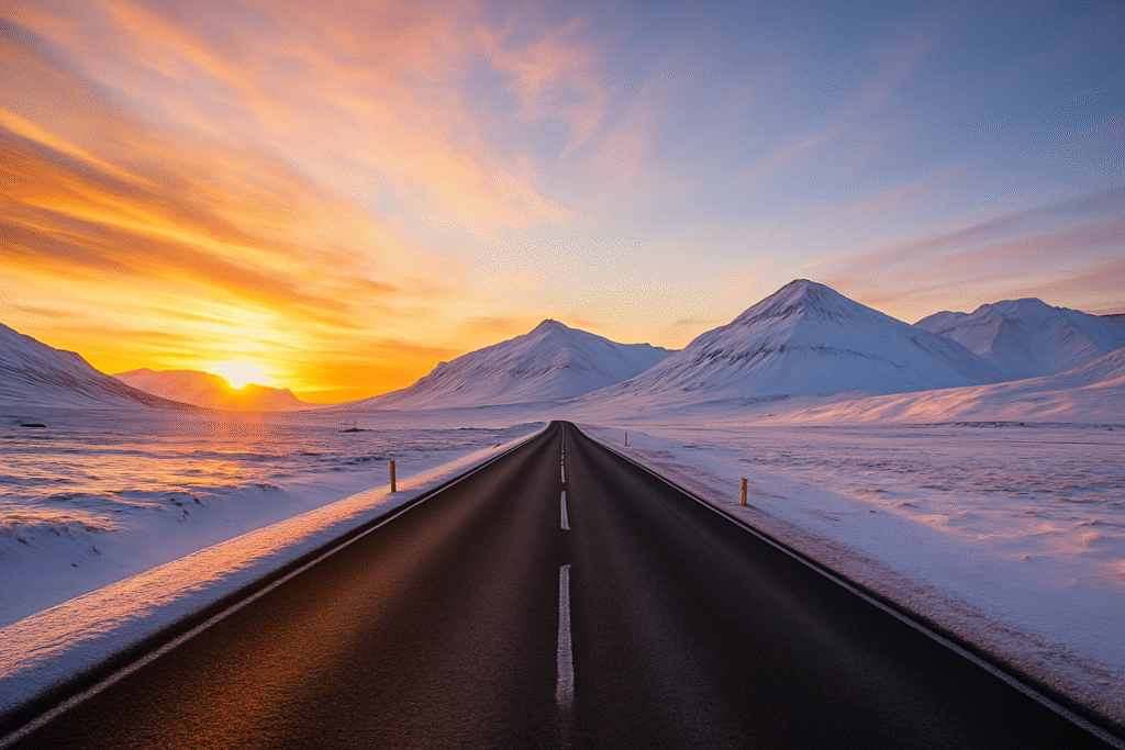 (📸“Empty Icelandic road with snowy mountains and sunrise glow”)