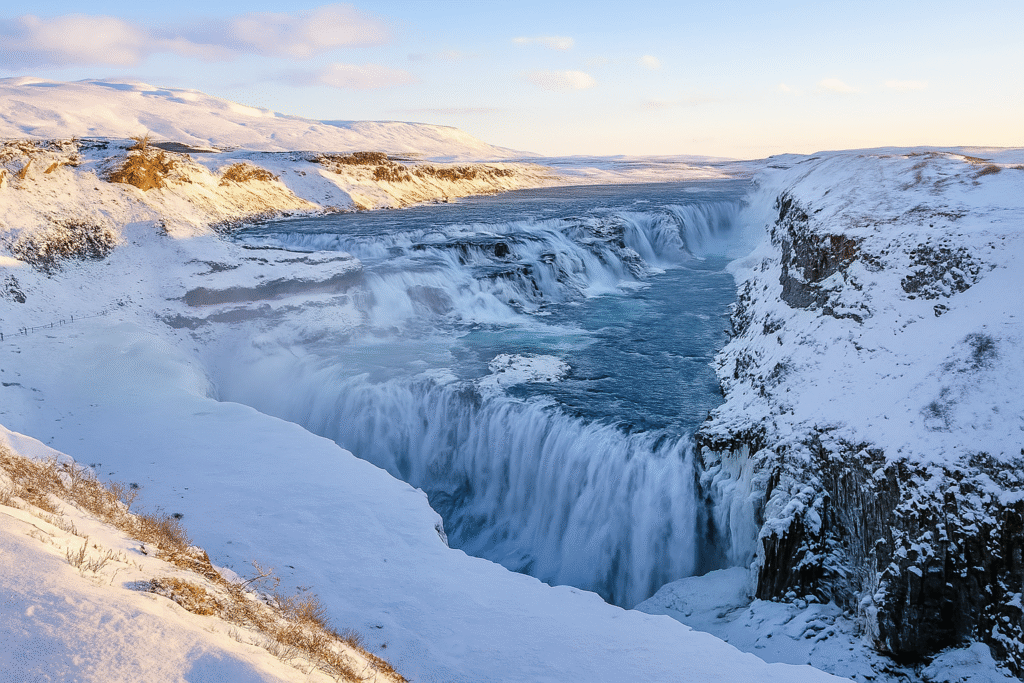(📸“Gullfoss waterfall in winter with icy canyon and mist”)