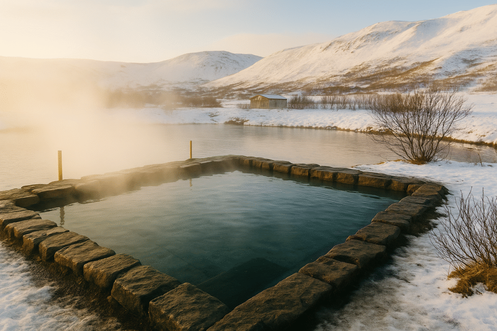(📸“Secret Lagoon hot spring in winter with steam and snow around”)