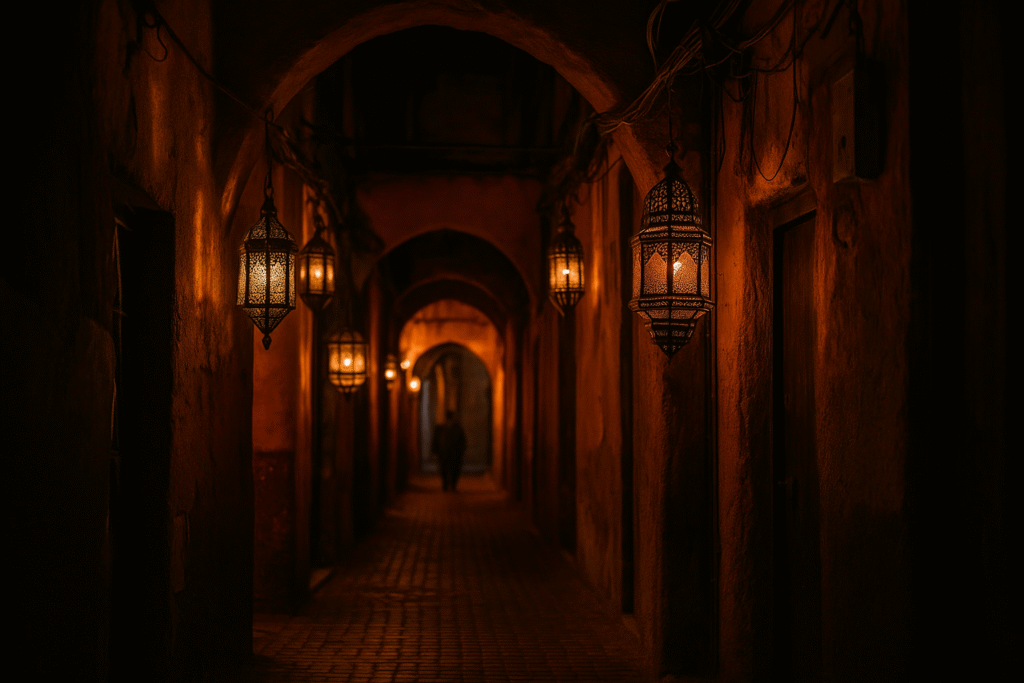 (📸“Lantern-lit alley in Marrakech Medina at night”)