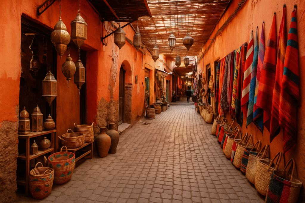 (📸“Colorful alley in the Medina of Marrakech with lanterns and shops”)