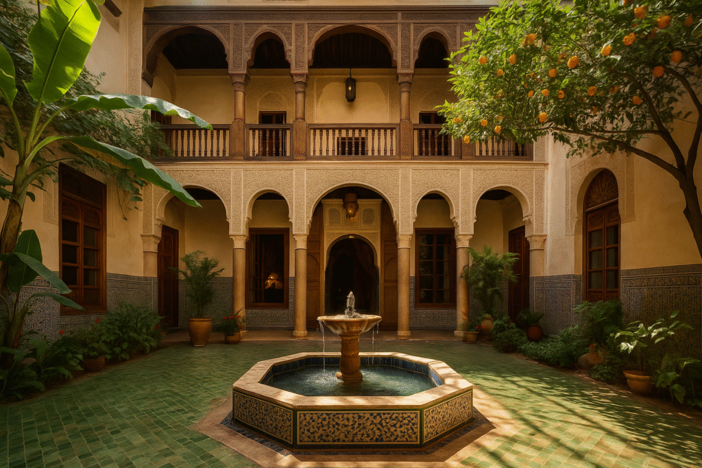 (📸“Traditional riad courtyard with fountain and plants in Marrakech”)
