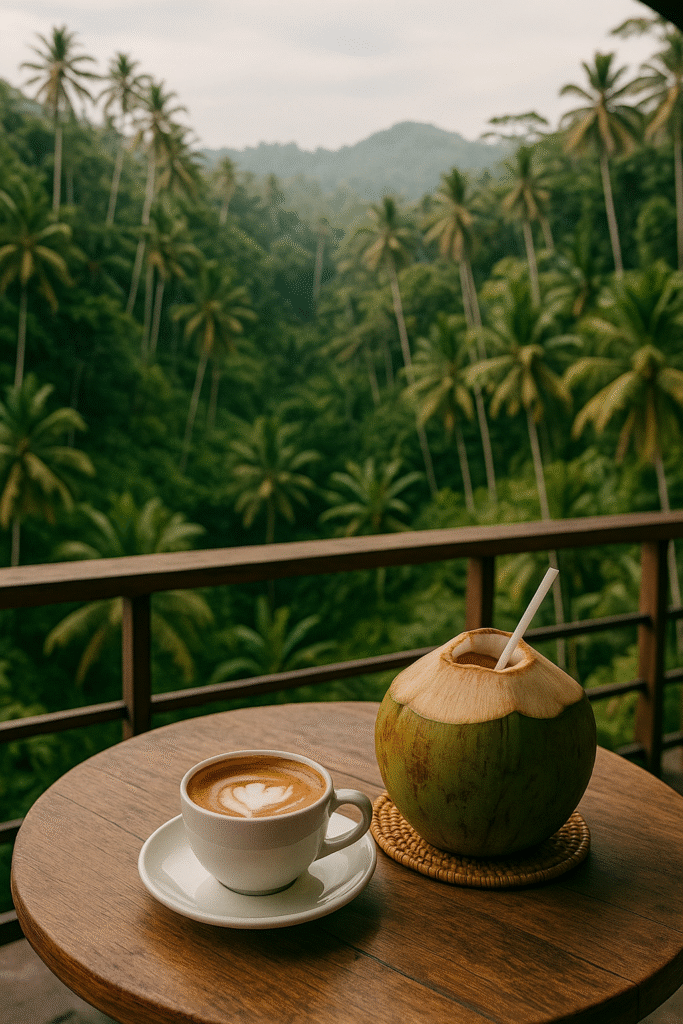 (📸 “Café with jungle view and coconut coffee in Ubud, Bali”)
